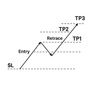 Opening three full sized positions can create unnecessary losses if the trade hits TP1 then retraces to SL.